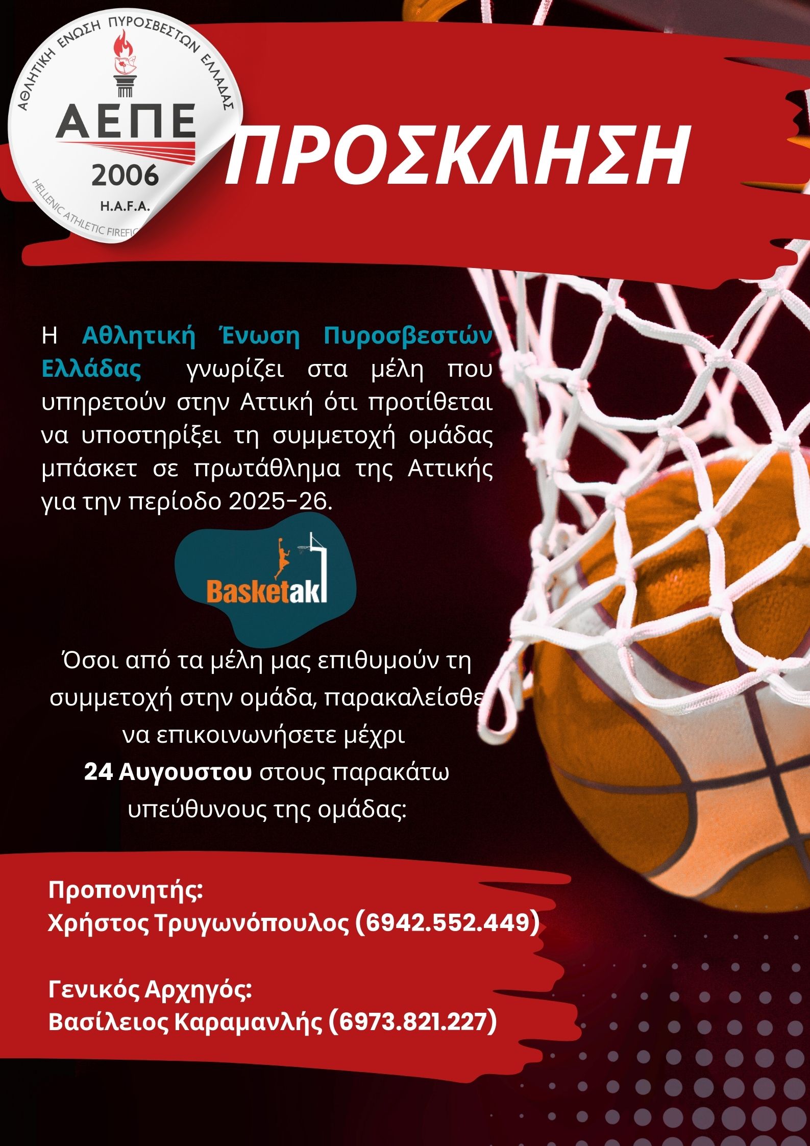 Ενημερώνουμε τα μέλη μας ότι κατά το διάστημα 20/03 – 08/04/2023 πρόκειται να διεξαχθεί το 1ο Κύπελλο Καλαθοσφαίρισης Αττικής σε συνεργασία με την «ΑΤΛΑΣ ΜΠΑΣΚΕΤ» η οποία θα αναλάβει την […]